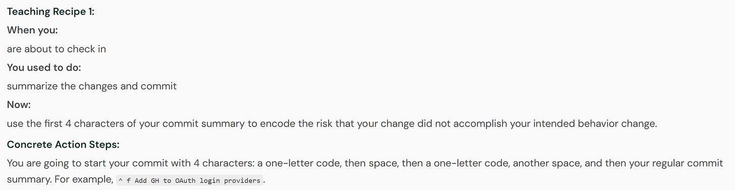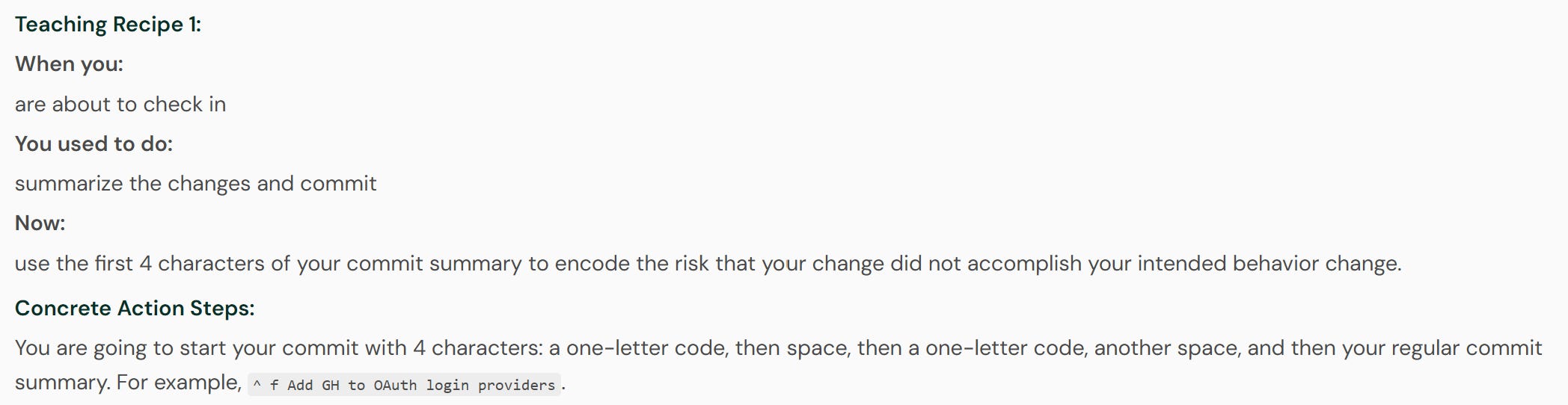 Deliberate practice reinforces this approach. Expertise does not grow from broad, exhausting effort. It develops through focused repetition on clearly defined elements with immediate feedback. When the step is small, feedback is fast. Refinement becomes possible without draining limited cognitive resources, as can be seen with these tiny and easily executable microbehaviors for commit notation.